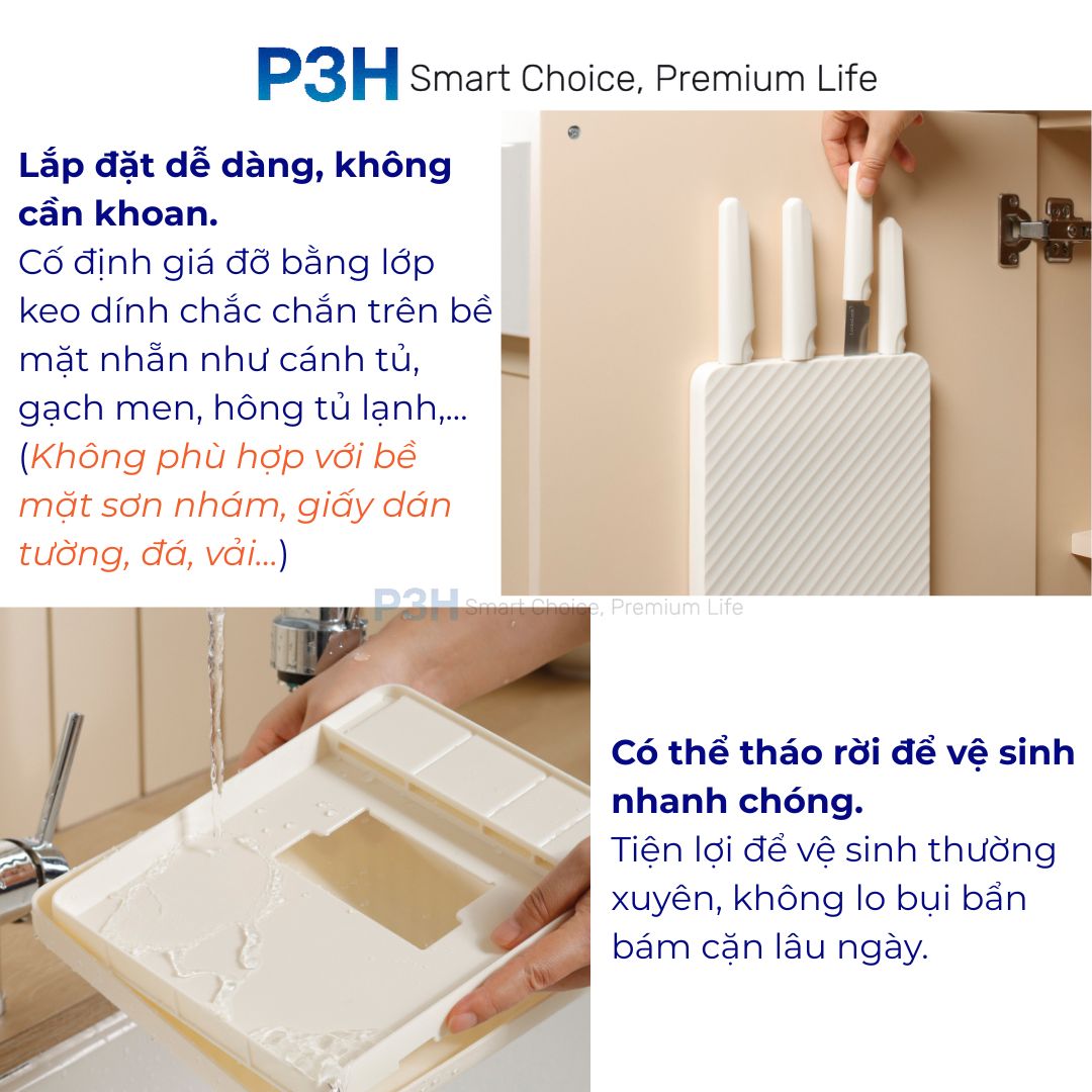 Dễ dàng lắp đặt bằng keo dính 2 mặt, chắc chắn – giúp tiết kiệm diện tích mặt bàn, giữ dao luôn khô thoáng và sạch sẽ.