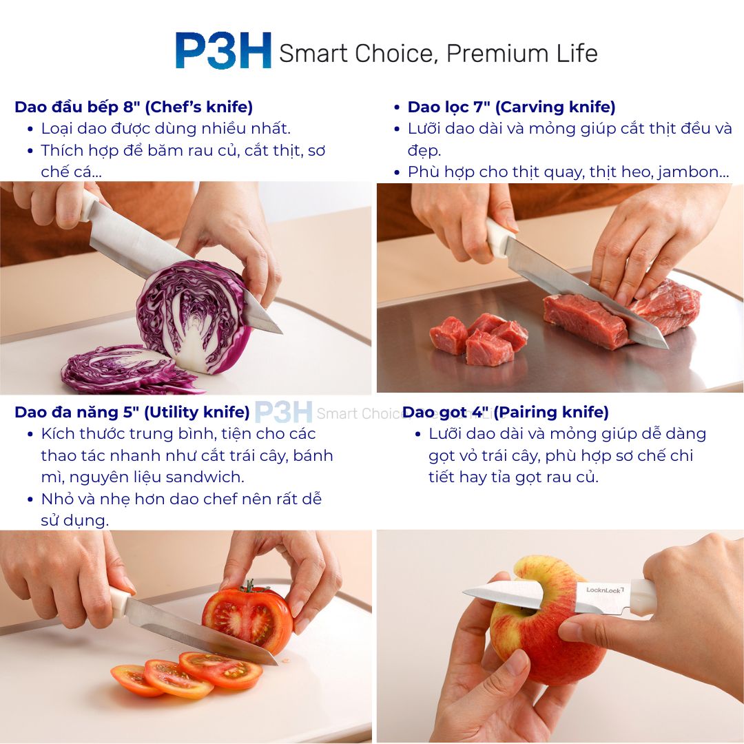 Từ thái thịt, cắt rau, gọt trái cây đến sơ chế thực phẩm – bộ dao đáp ứng đầy đủ, phù hợp gia đình lẫn bếp chuyên nghiệp.