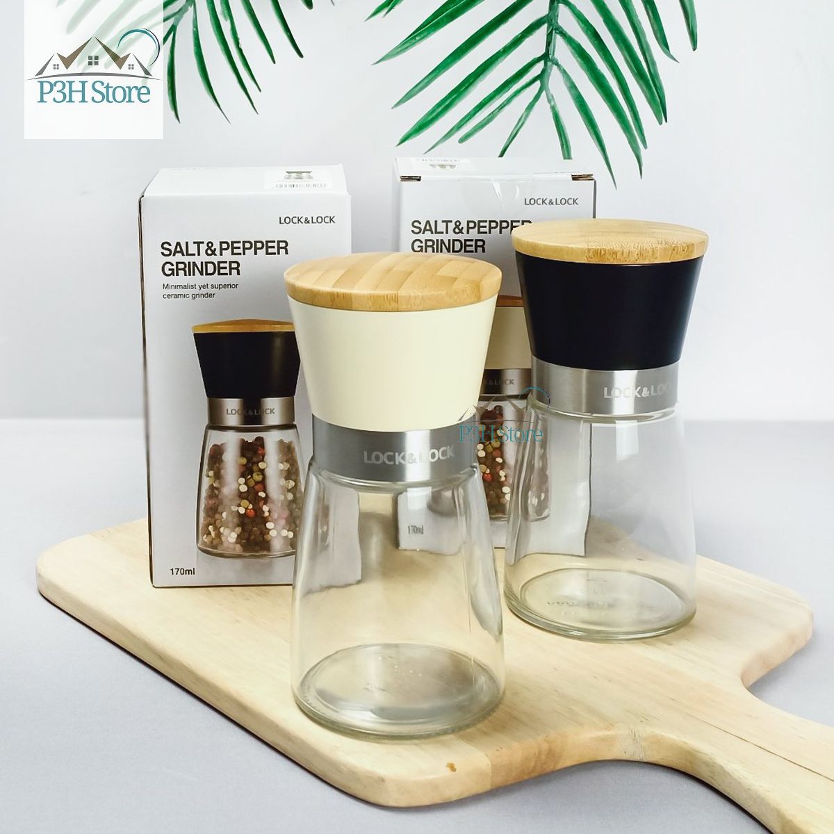Cối xay tiêu thủy tinh Lock&Lock 170ml lưỡi sứ nắp gỗ sồi tiện dụng CKO116