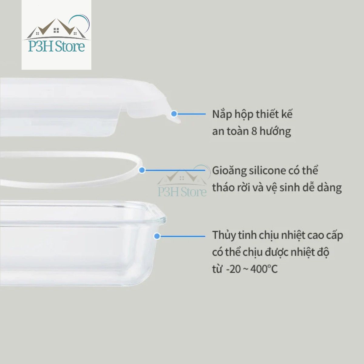 - Phần thân hộp được làm bằng thủy tinh chịu nhiệt, có thể sử dụng an toàn khi hâm nóng thức ăn trong lò vi sóng và lò nướng.