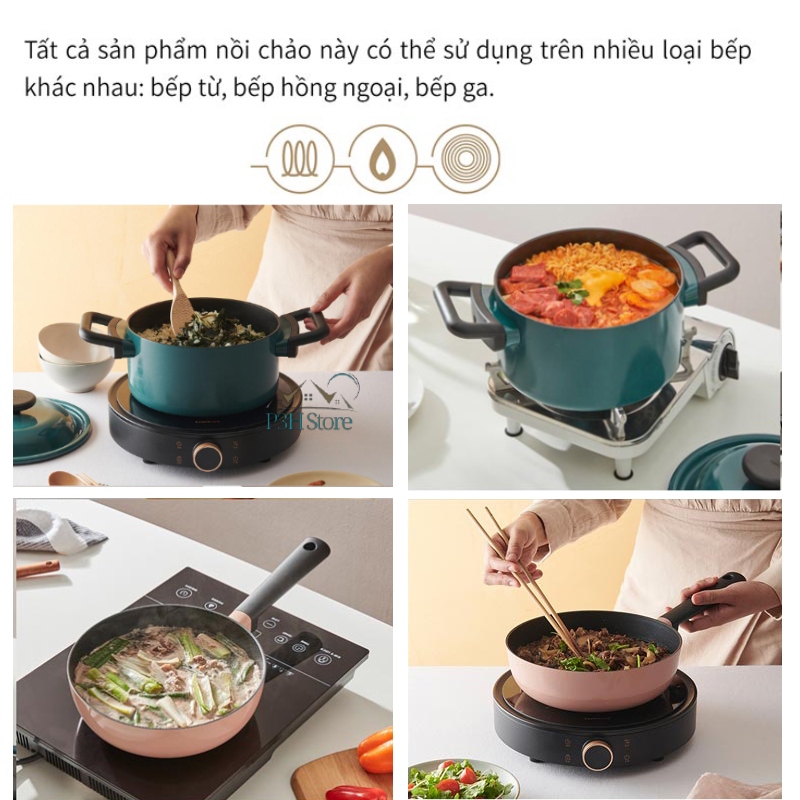 - Tất cả sản phẩm nồi chảo này có thể sử dụng trên nhiều loại bếp khác nhau: bếp từ, bếp hồng ngoại, bếp ga.