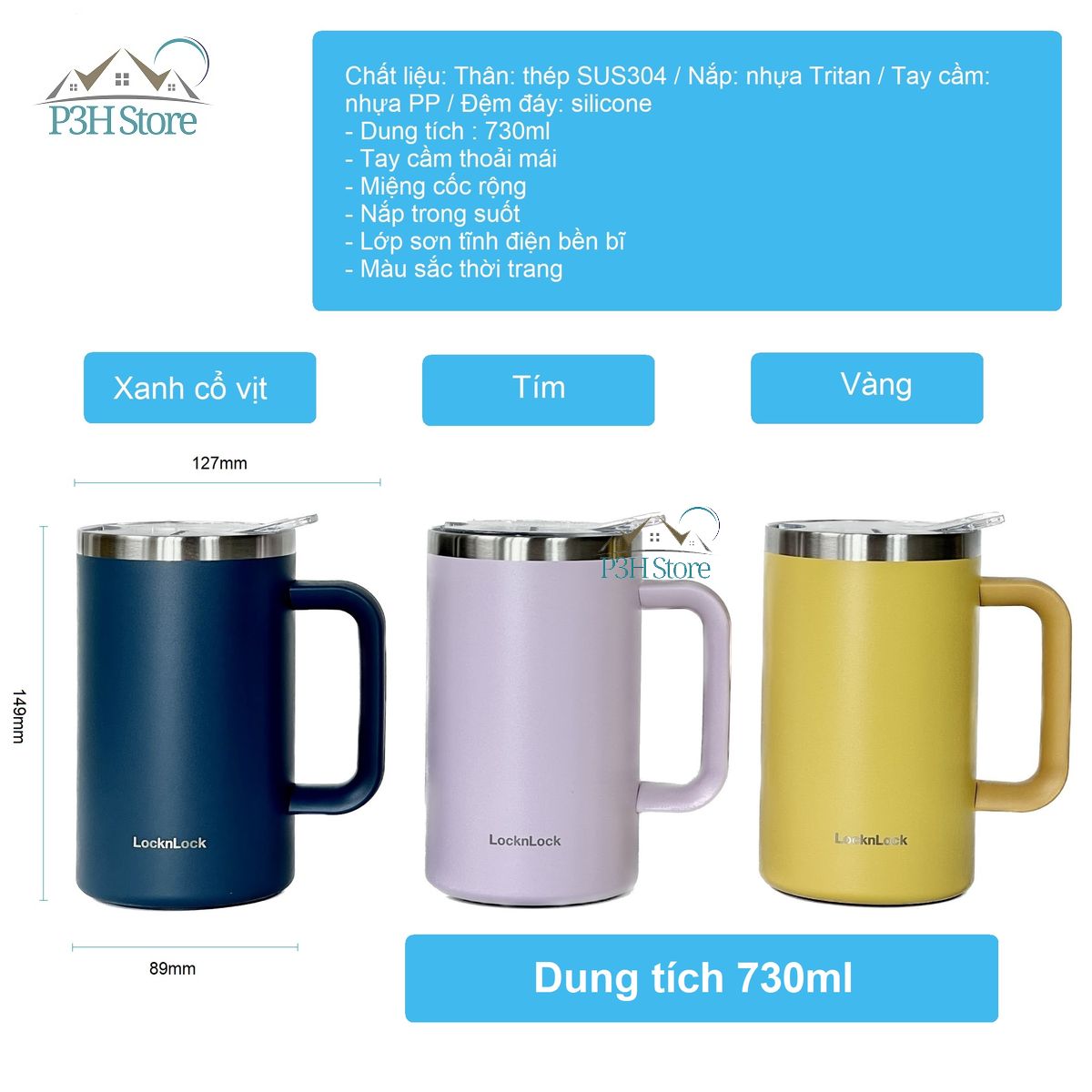 Chất liệu: Thân: thép SUS304 / Nắp: nhựa Tritan / Tay cầm: nhựa PP / Đệm đáy: silicone
