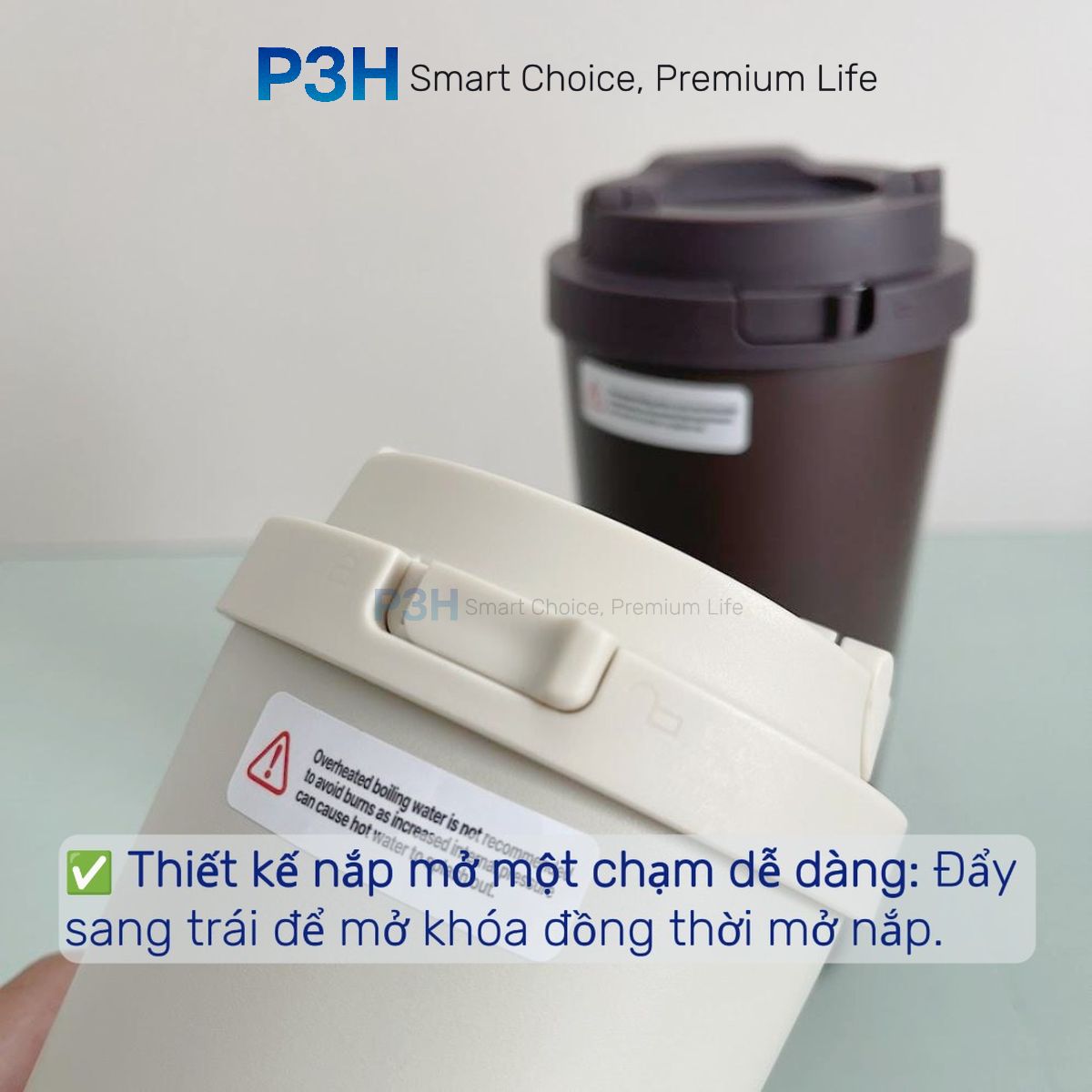 → Đẩy sang trái để mở khóa và mở nắp, cực tiện khi lái xe, tập gym, hoặc dùng tại văn phòng.