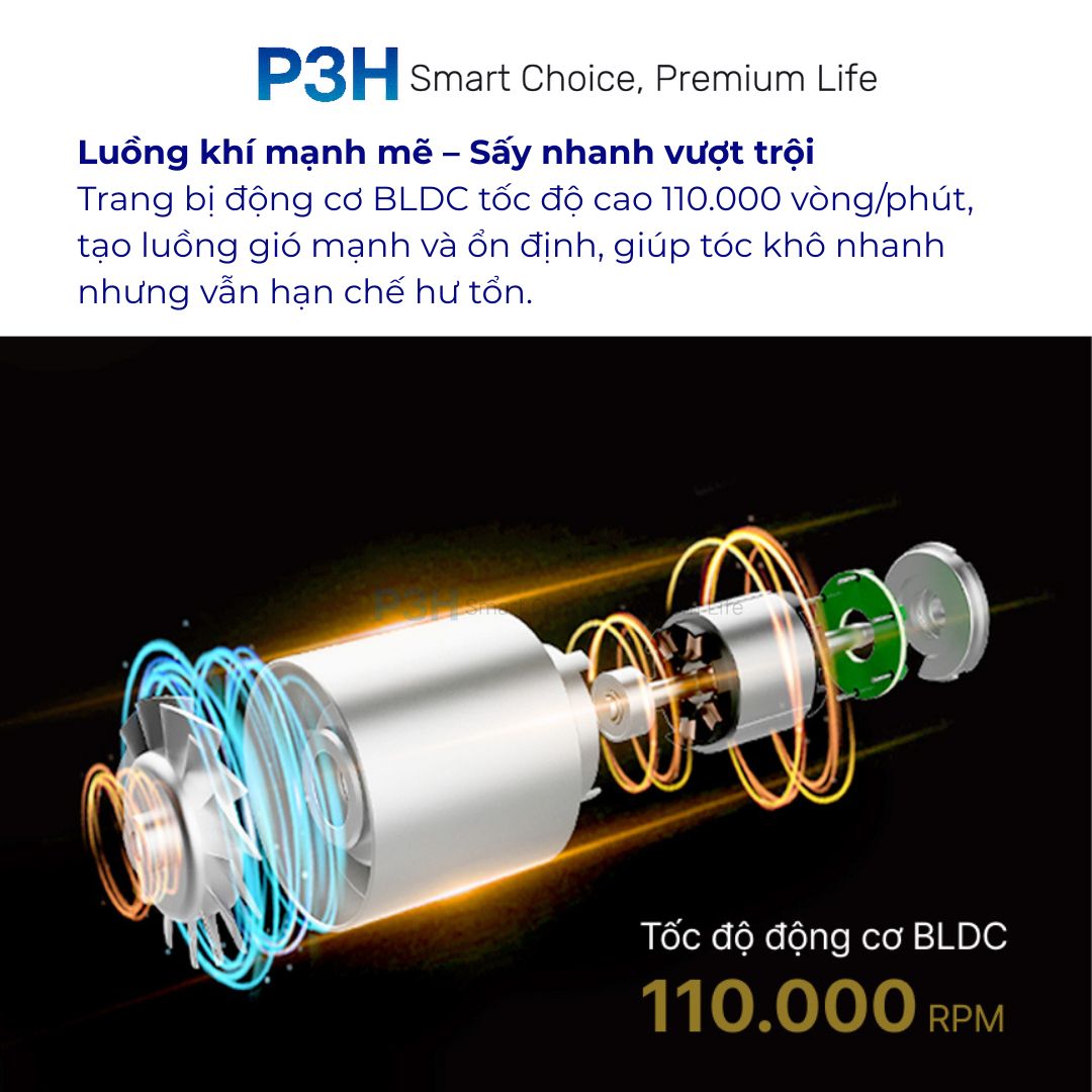 Trang bị động cơ BLDC tốc độ cao 110.000 vòng/phút, tạo luồng gió mạnh và ổn định, giúp tóc khô nhanh nhưng vẫn hạn chế hư tổn.