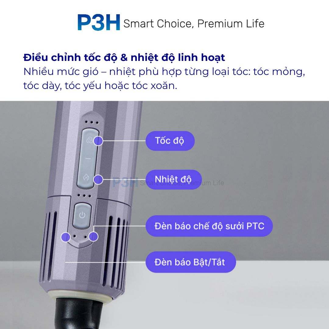 - Nhiều mức gió – nhiệt phù hợp từng loại tóc: tóc mỏng, tóc dày, tóc yếu hoặc tóc xoăn.