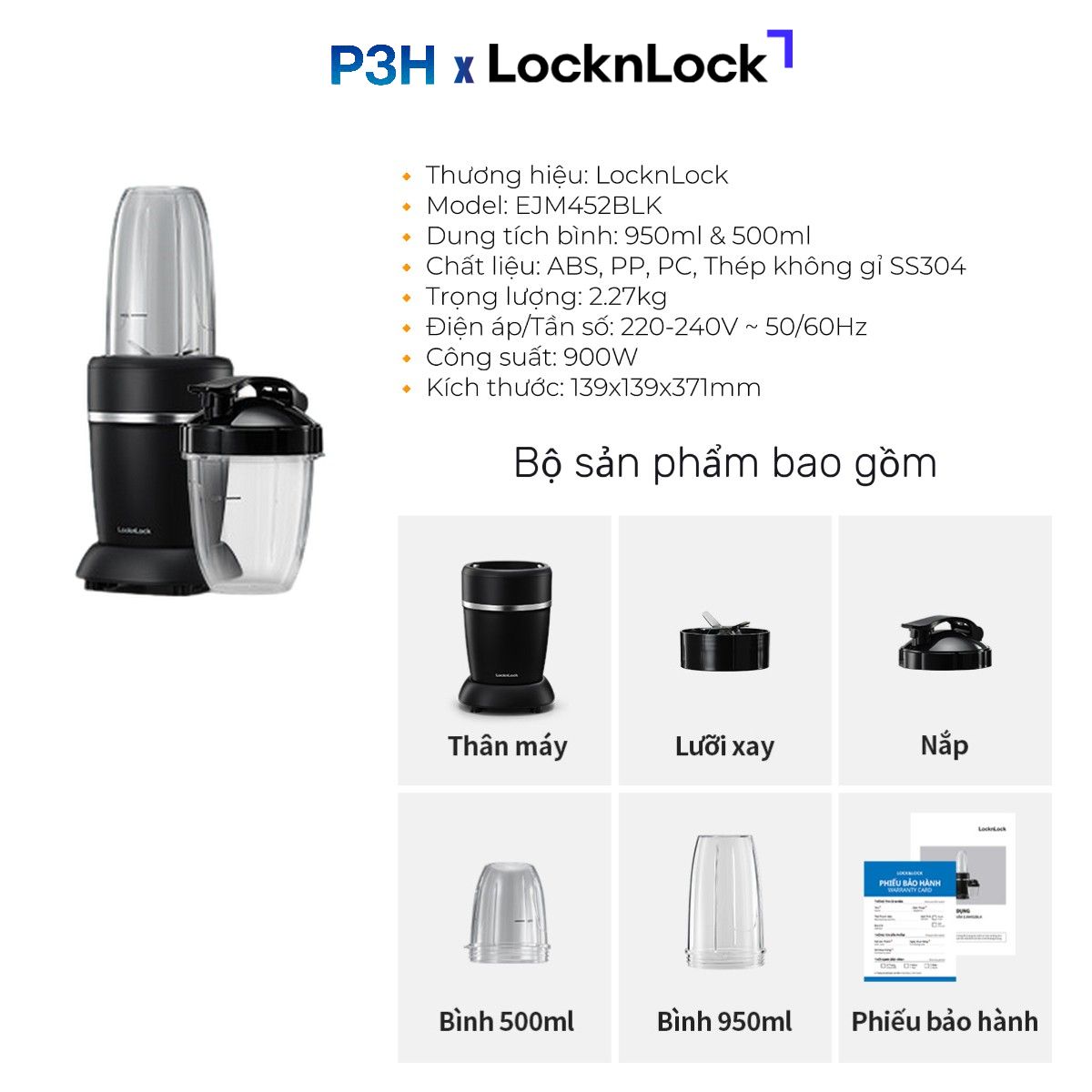 Máy Xay Sinh Tố LocknLock EJM452BLK – Xay Đá Mạnh Mẽ, 2 Bình Tiện Lợi (950ml & 500ml)