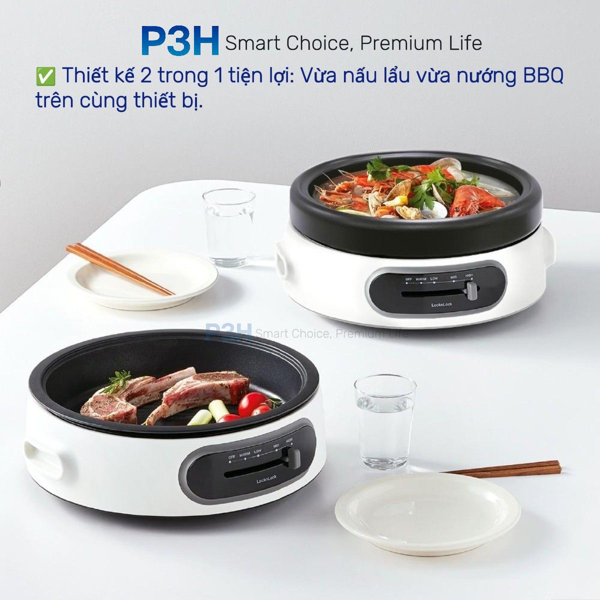 Thiết kế 2 trong 1 tiện lợi: Vừa nấu lẩu vừa nướng BBQ trên cùng thiết bị.