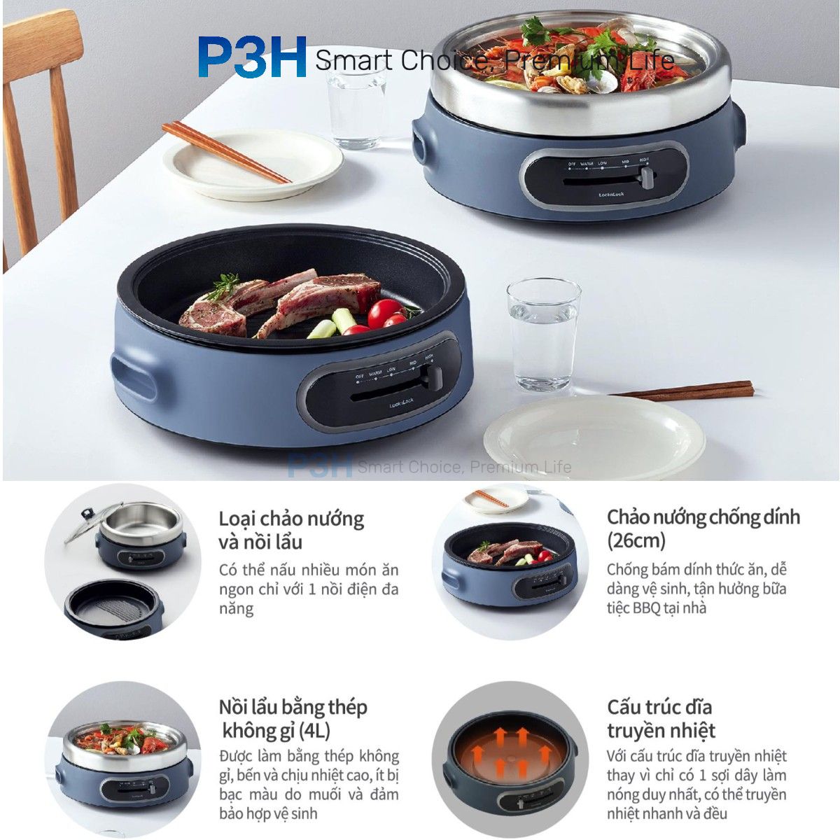 Nồi Điện Đa Năng LocknLock Nướng & Lẩu 2 Trong 1 nồi lẩu dung tích 4L Nồi ướng 26cm Xanh Navy EJP542NVY EJP544WHT